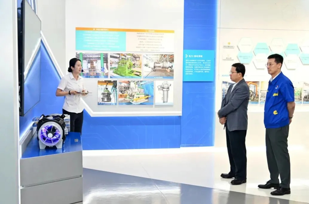 在張勇的陪同下,唐立新院士一行參觀了沈鼓集團展覽展示中心,詳細了解企業的發展歷程、重大裝備自主化創新成果、全生命周期客戶服務體系等情況。