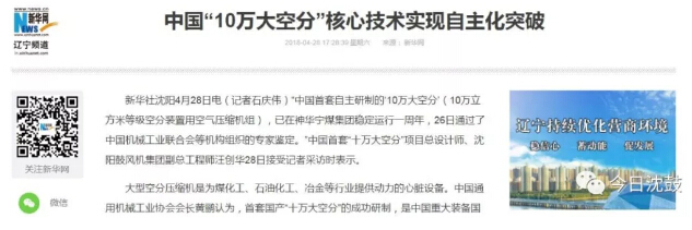 4月28日新華社報道了中國首臺套自主研制的十萬空分機組通過國家鑒定的相關消息——